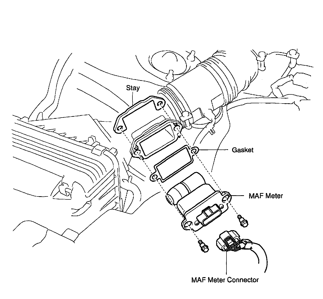b. Remove the 2 bolts, MAF meter, gasket and stay.