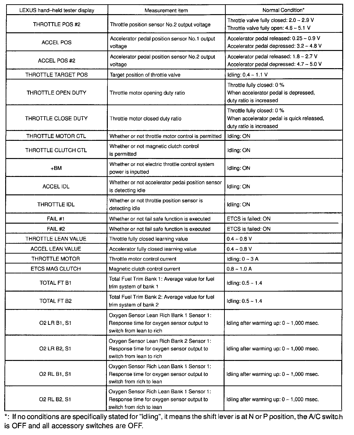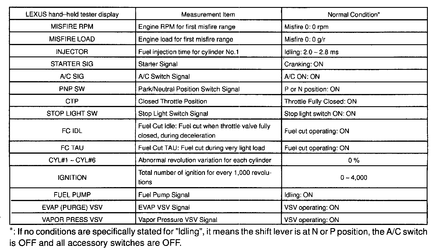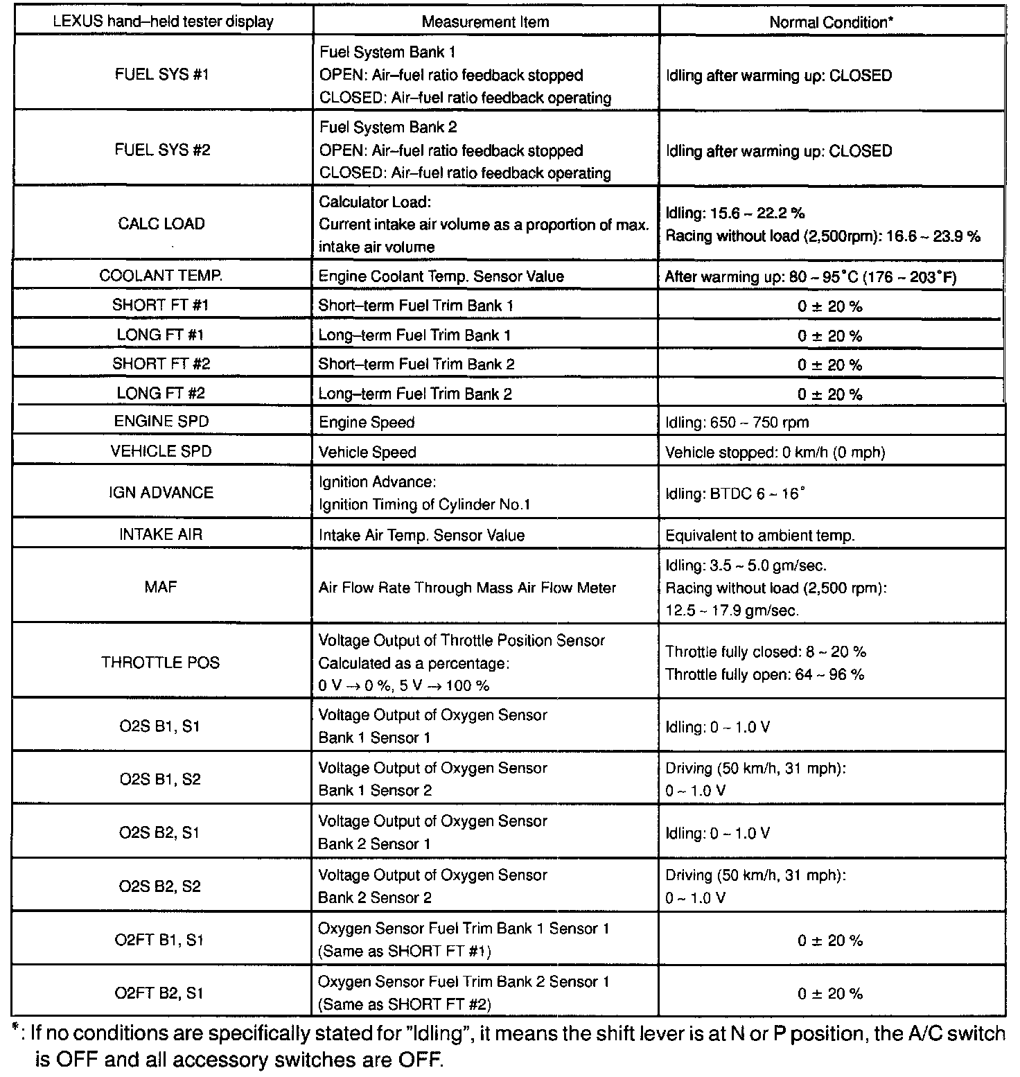ENGINE OPERATING CONDITIONNOTE: The values given below for "Normal Condition" are representative values, so a vehicle may still be normal even if its value differs varies from those listed here. So do not decide whether a part is faulty or not solely according to the "Normal Condition" here.