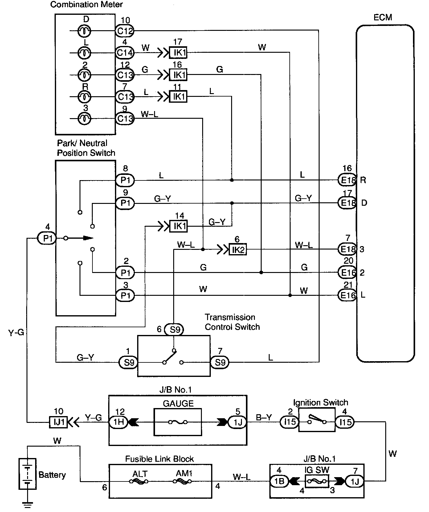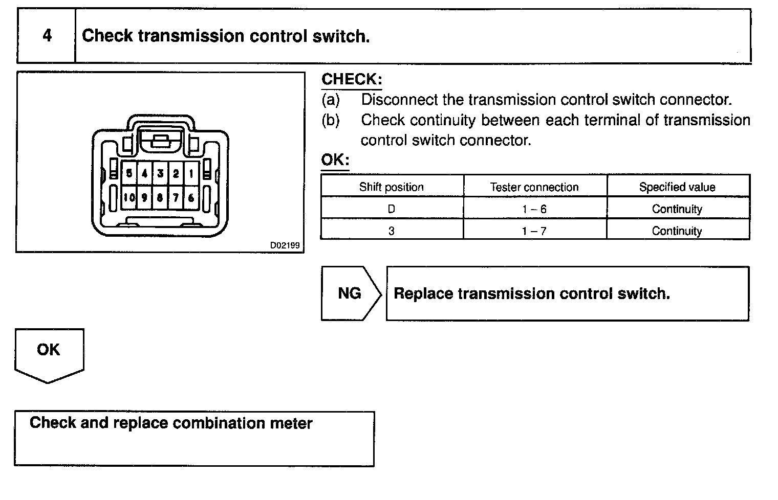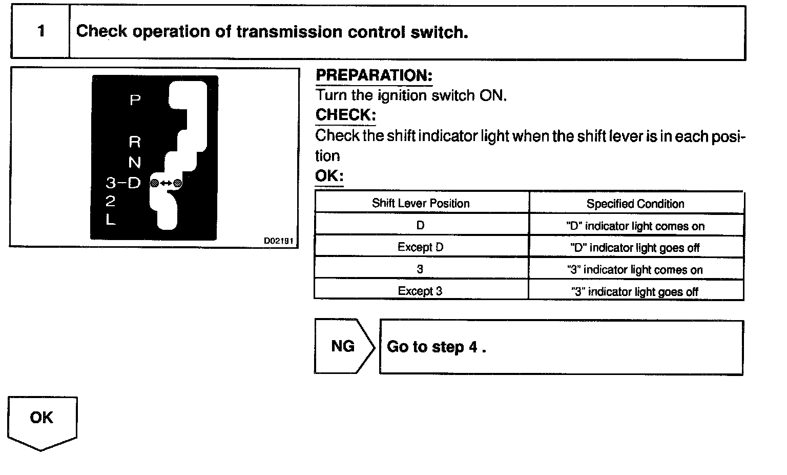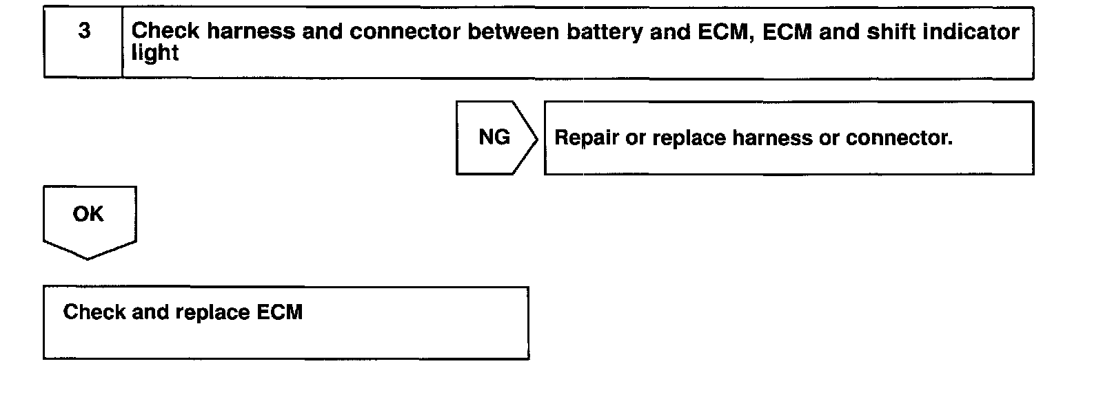 CIRCUIT DESCRIPTIONWhen the shift lever is in the 3 position (with transmission control switch for D and 3 is pressed), "3" in the shift position indicator light will come on and when the shift lever is in the D position (with transmission control switch for D and 3 is released), "D" in the shift position indicator light will come on.