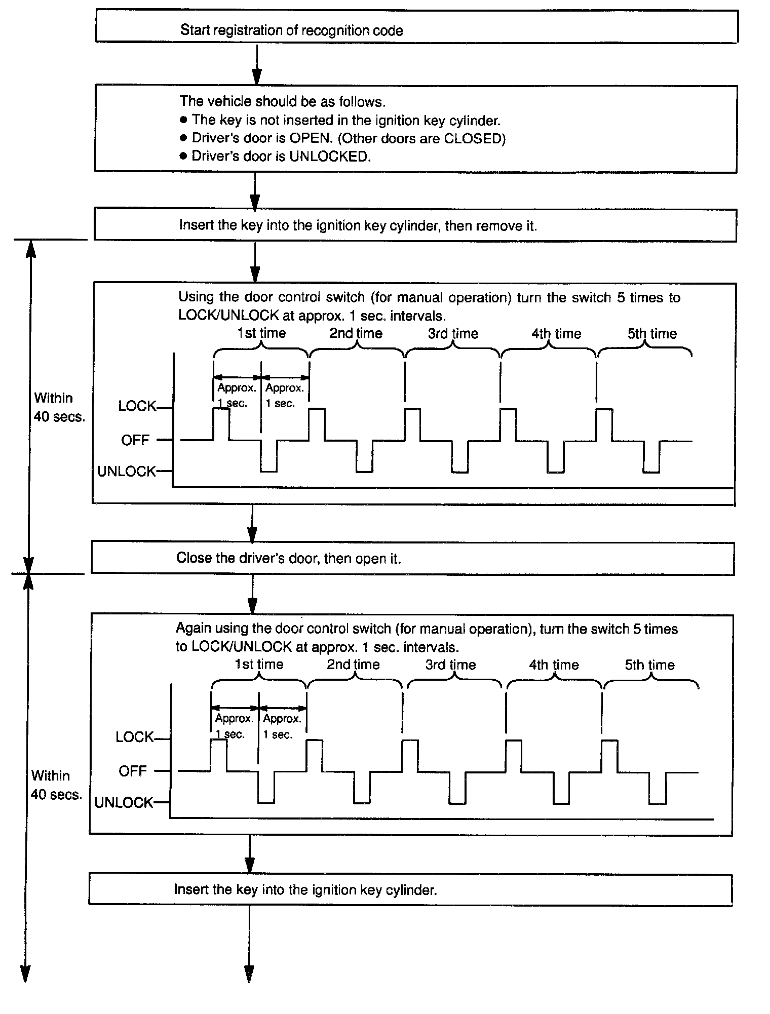 - If the prescribed conditions are not entered while registering the transmitter code, the wireless door lock ECU returns to normal operation.