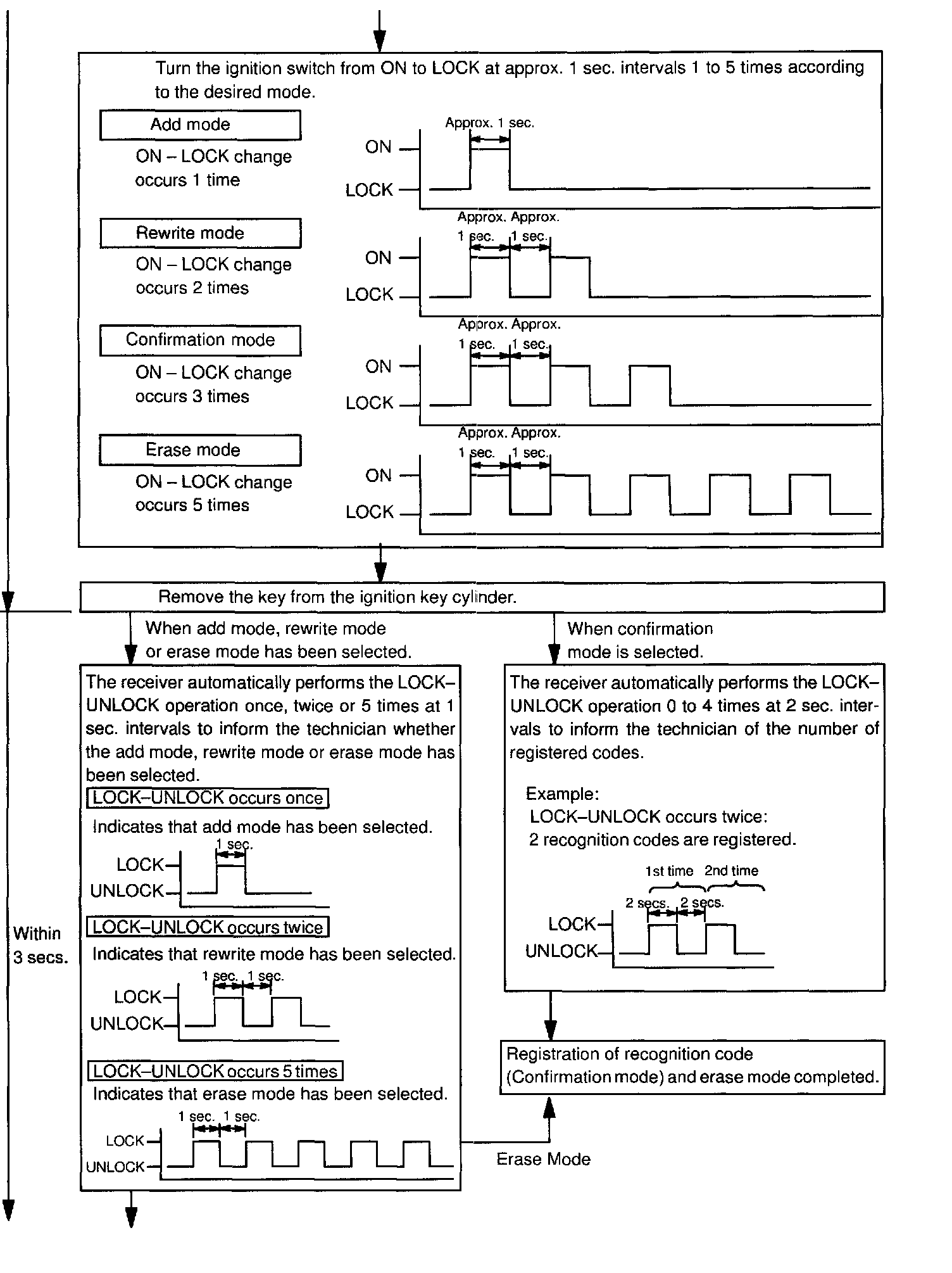 - The rewrite mode is used to erase all previous registered codes before registering new recognition codes. This mode is used before registering new transmitter or wireless door lock ECU.