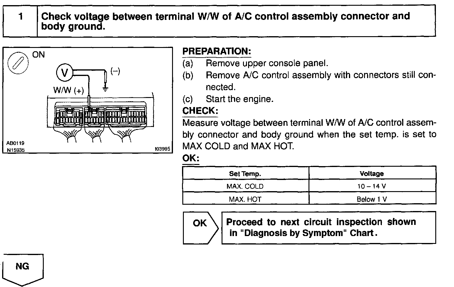 CIRCUIT DESCRIPTIONIf the target air mix damper position is on the hot side beyond a predetermined level, the A/C control assembly turns ON Tr inside the A/C control assembly.