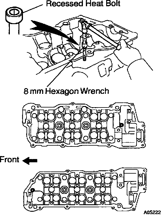 a. Using an 8 mm hexagon wrench, remove the cylinder head (recessed head) bolt on each cylinder head, then repeat for the other side, as shown.