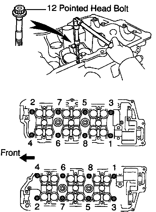 b. Uniformly loosen and remove the 8 cylinder head (12 pointed head) bolts on each cylinder head in several passes and in the sequence shown, then repeat for the other side, as shown. Remove the 16 cylinder head bolts and plate washers.