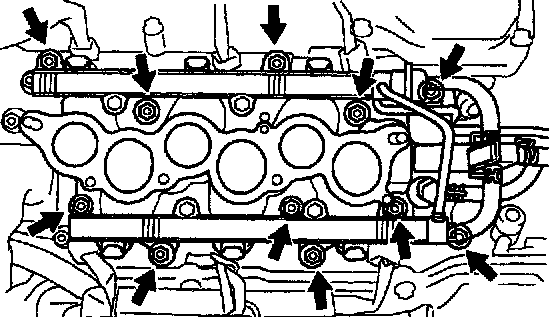 d. Remove the 9 bolts, 2 nuts, 2 plate washers, the intake manifold, delivery pipes and injectors assembly.
