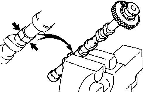 NOTICE: Since the thrust clearance of the camshaft is small, the camshaft must be kept leveled while it is being installed. If the camshaft is not kept leveled, the portion of the cylinder head receiving the shaft thrust may crack or be damaged, causing the camshaft to seize or break. To avoid this, the following steps should be carried out.