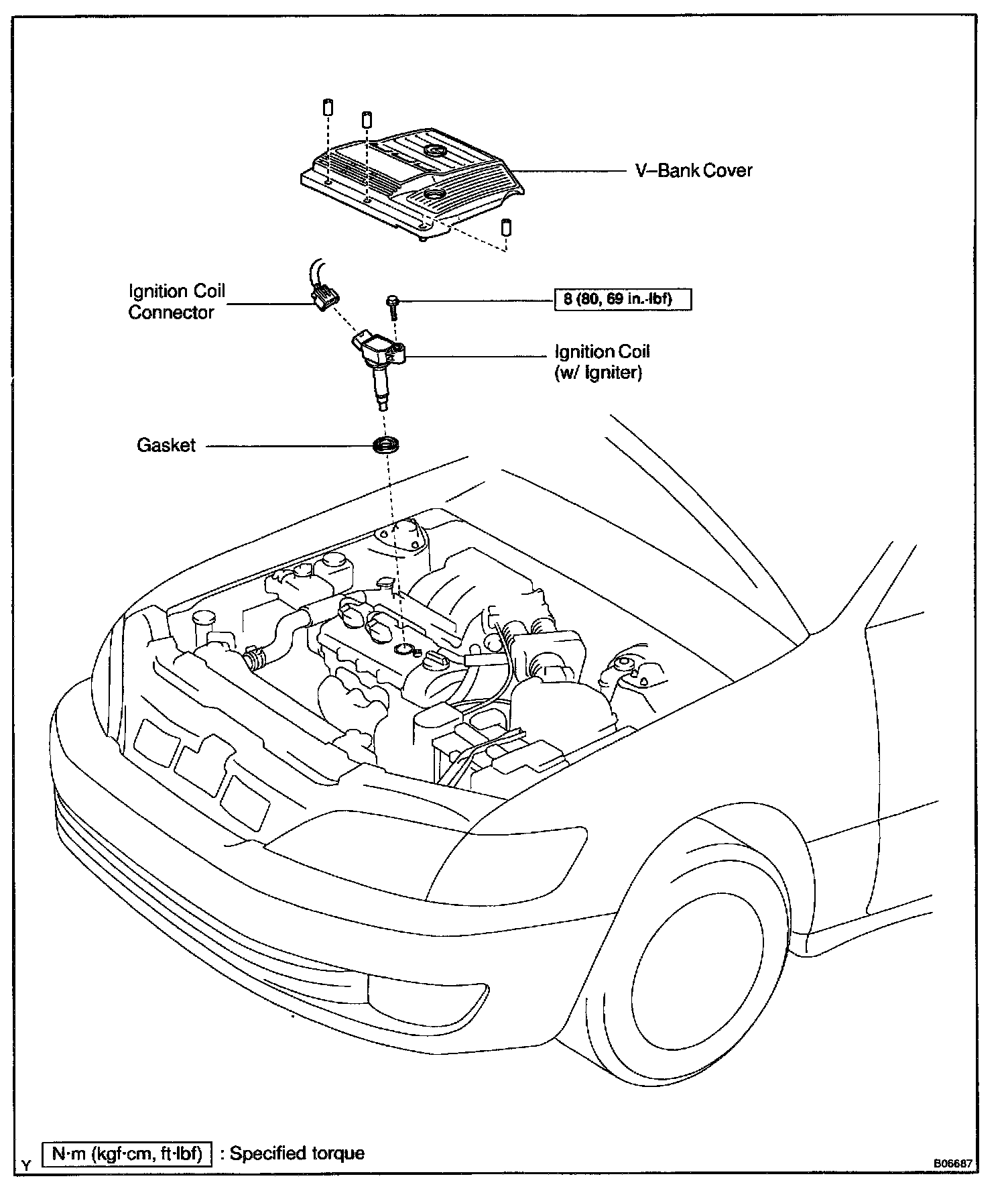b. Remove the bolt, and pull out the ignition coil. Remove the 6 ignition coils.