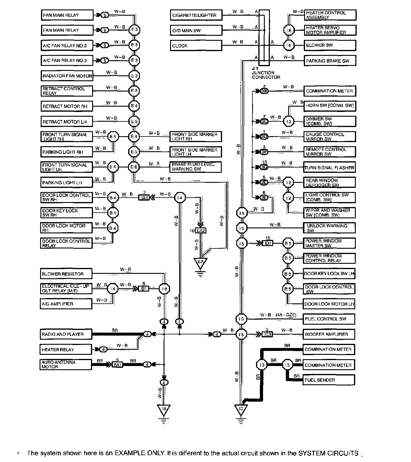 The ground points circuit diagram shows the connections from all major parts to the respective ground points. When troubleshooting a faulty ground point, checking the system circuits which use a common ground may help you identify the problem ground quickly. The relationship between ground points (EA, IB and IC shown) can also be checked this way.