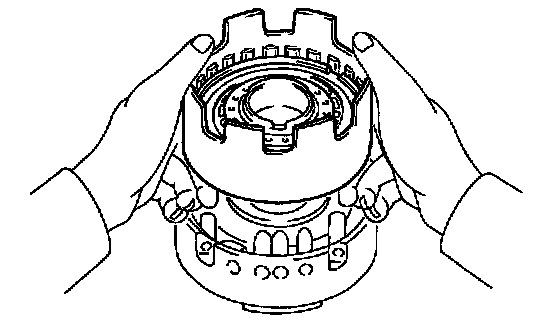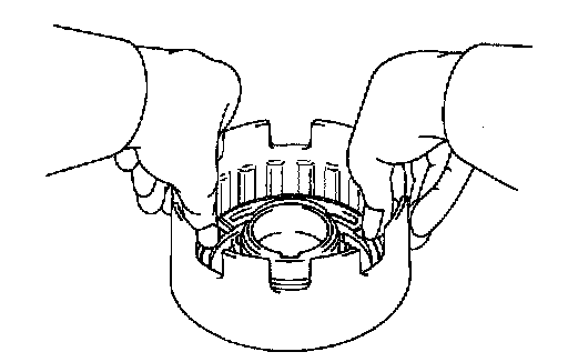 b. Being careful not to damage the O-rings press in the direct clutch piston into the clutch drum with both hands.