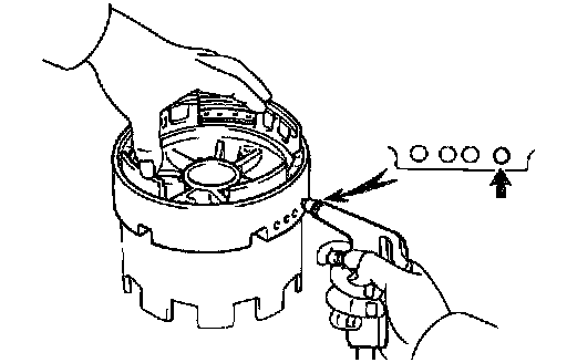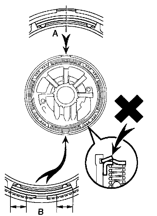 HINT: After assembling the O/D support assembly completely, align the position of the piston with the position shown in the illustration "A". Align the end gap of the snap ring as shown in the illustration "B". Make sure that the snap ring is not on the part of return spring which prevents the spring from coming off. Check this on 8 places.