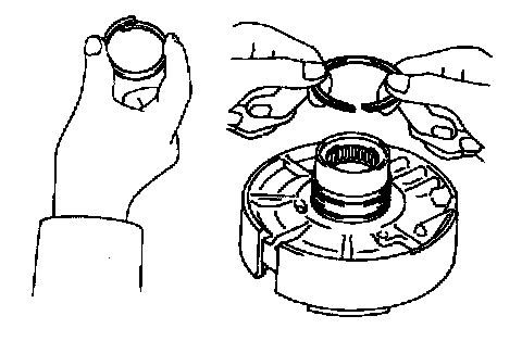 b. Install the 2 oil seal rings to the O/D support groove, then snug them sown by squeezing their ends together.