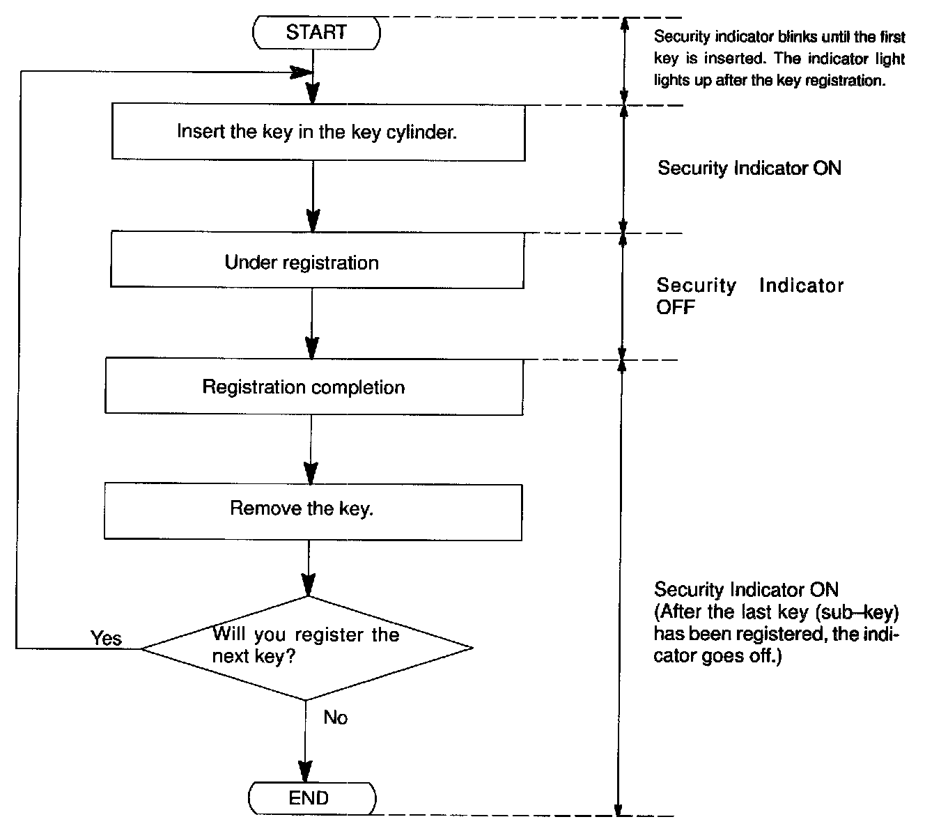- When a key is not inserted in the key cylinder in the automatic registration mode, the security indicator always lights on.