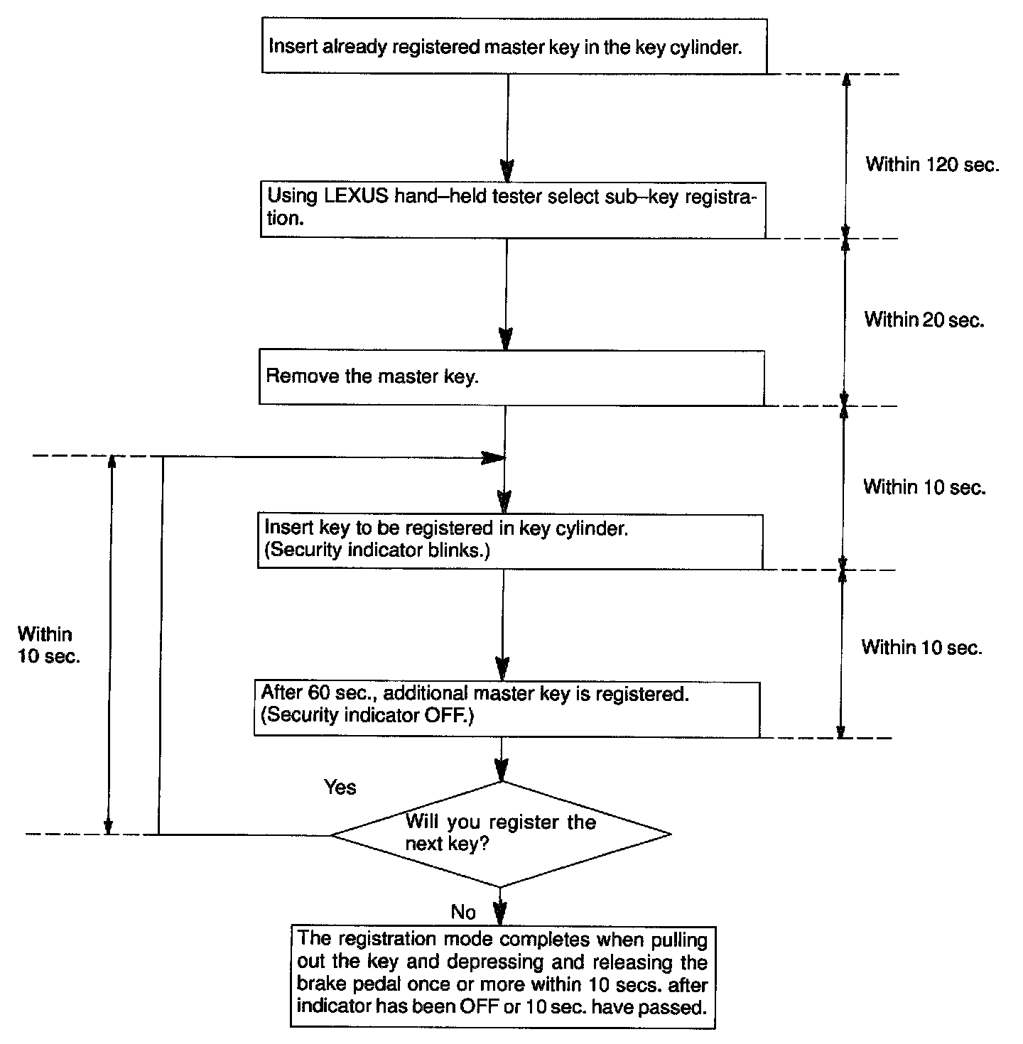 There are 2 ways for registration of additional sub-key, one way is depressing brake pedal and acceleration pedal and the other way is using LEXUS hand-held tester.