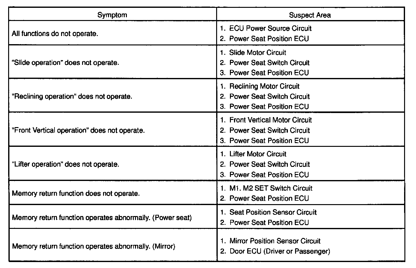 - If the trouble still reappears even through there are no abnormalities in any of the other circuits, then check and replace the Power Seat Position ECU as the last step.