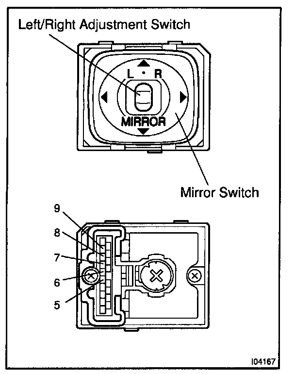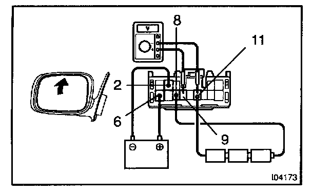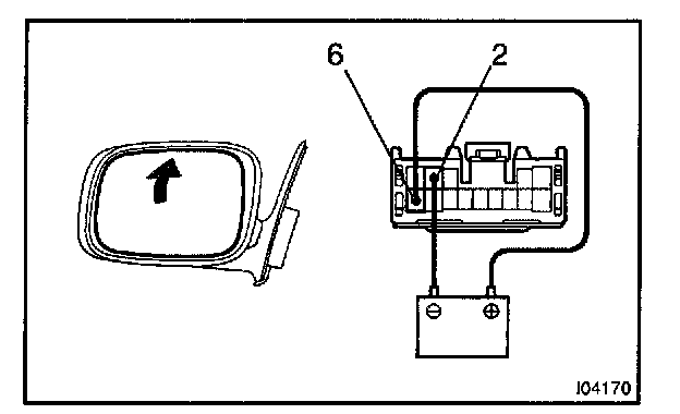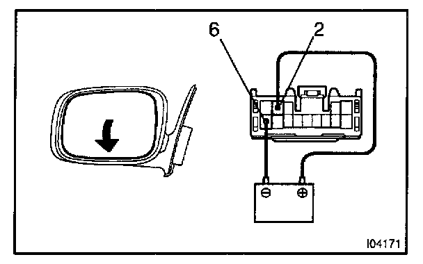 c. Connect the positive (+) lead from the battery to terminal 6 and the negative (-) lead to terminal 2, and check that the mirror turns upward.