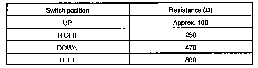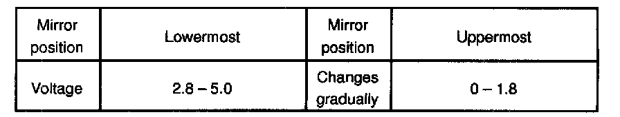 d. Apply battery positive voltage to terminals 2 and 6, then check that the voltage gradually changes according to the table below while the mirror moves between the uppermost position and lowermost position.
