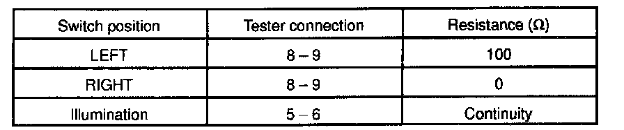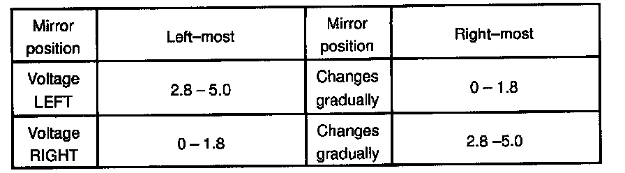 g. Apply battery positive voltage to terminals 1 and 2, then inspect that the voltage gradually changes according to the table below while the mirror moves between the left- most position and right-most position.