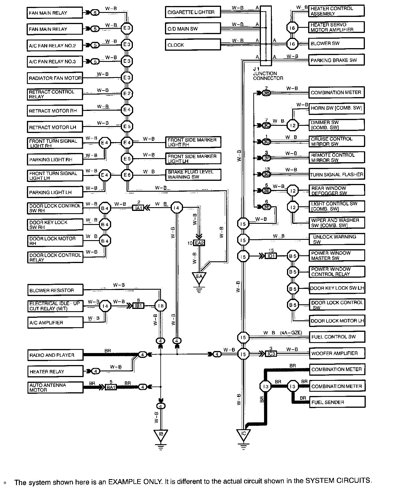 The ground points circuit diagram shows the connections from all major parts to the respective ground points. When troubleshooting a faulty ground point, checking the system circuits which use a common ground may help you identify the problem ground quickly. The relationship between ground points (EA, IB and IC shown) can also be checked this way.