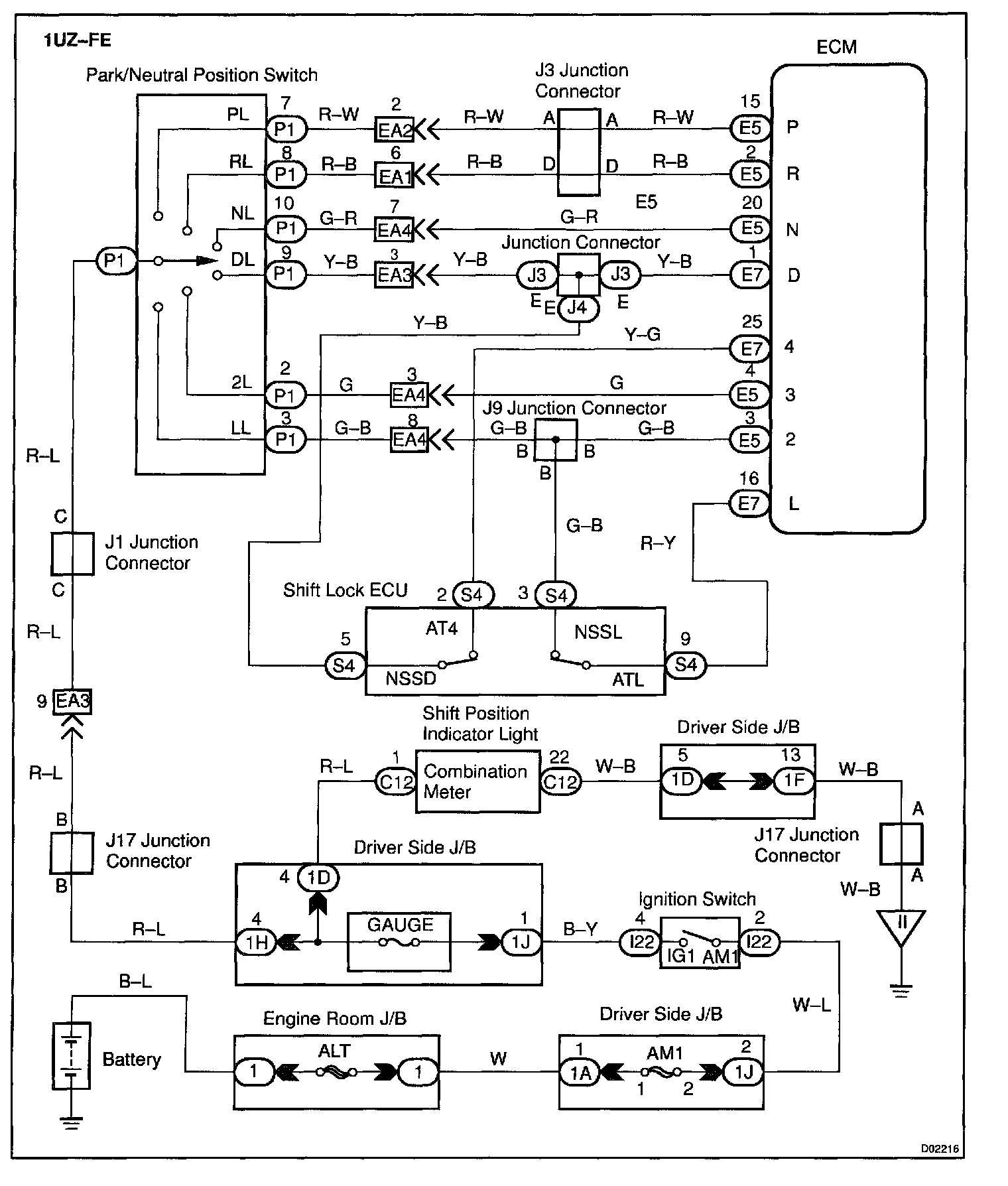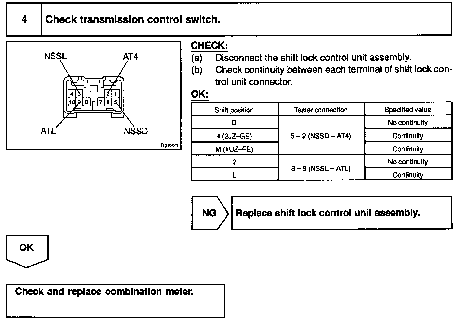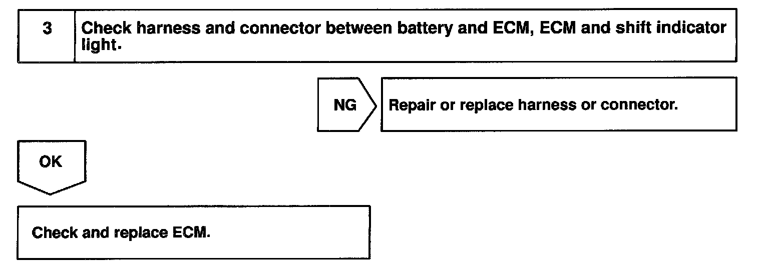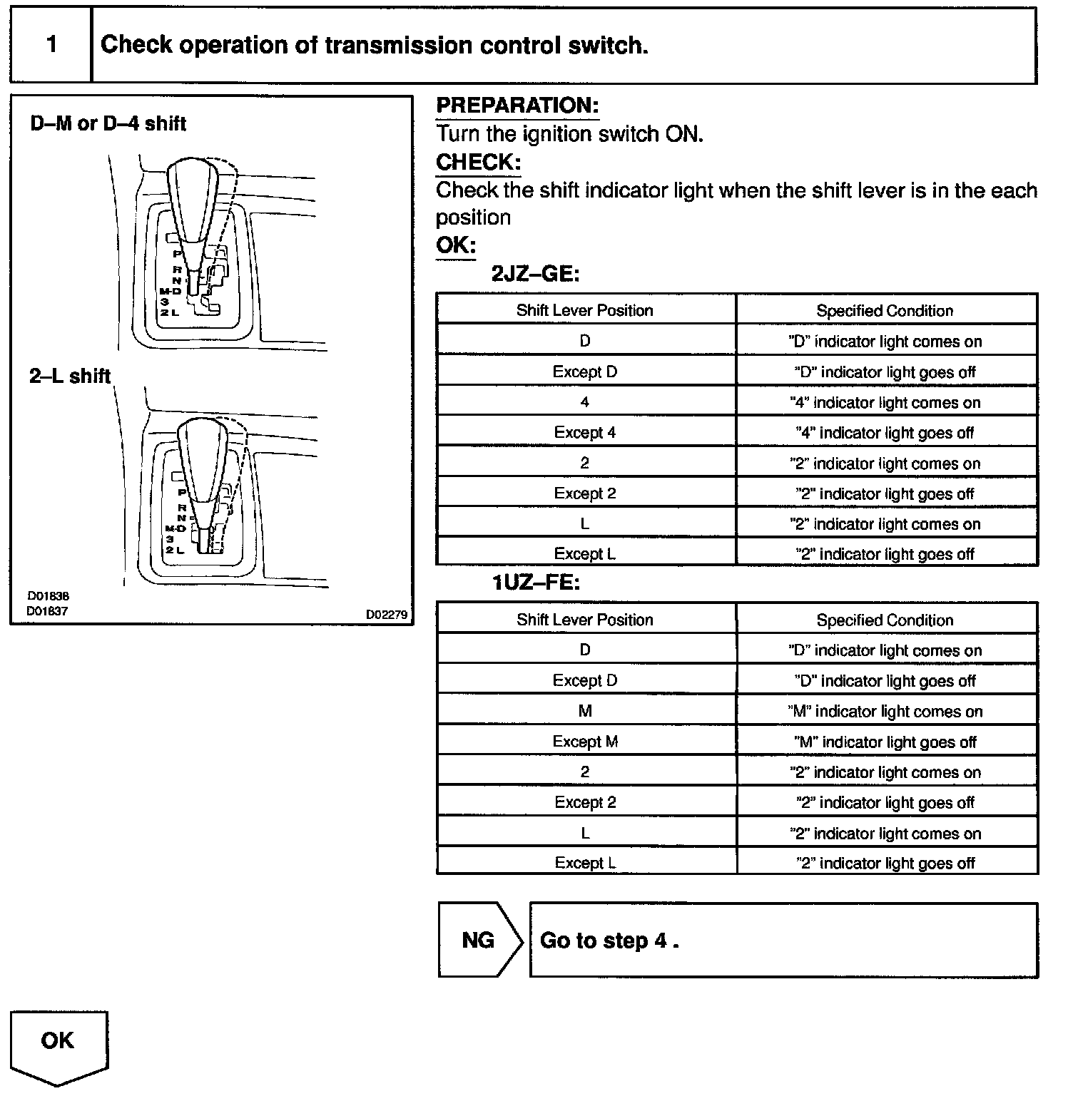 CIRCUIT DESCRIPTIONWhen the shift lever is in the 4 or M position (with transmission control switch for D and 4 or M pressed), "4"or "M" in the shift position indicator light will come on and when the shift lever is in the D position (with transmission control switch for D and 4 or M released), "D" in the shift position indicator light will come on. When the shift lever is in the L position (with transmission control switch for 2 and L pressed), "L" in the shift position indicator light will come on and when the shift lever is in the 2 position (with transmission control switch for 2 and L released), "2" in the shift position indicator light will come on.