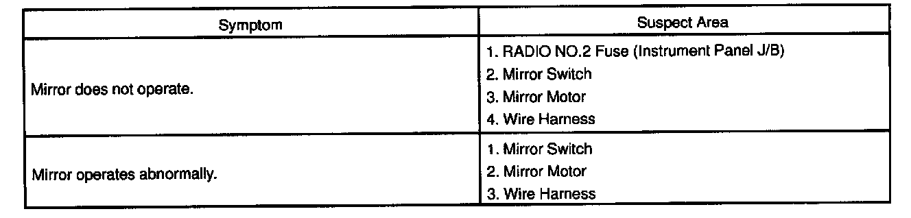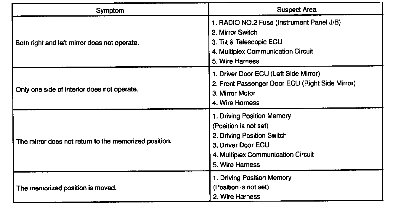 The table below will be useful for you in troubleshooting these electrical problems. The most likely causes of the malfunction are shown in the order of their probability. Inspect each part in the order shown, and replace the part when it is found to be faulty.Power Mirror Control System (With Memory System):