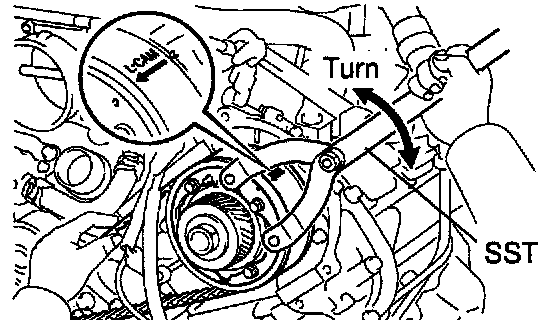 c. Using SST, turn the LH camshaft timing pulley counterclockwise until there is tension between the crankshaft timing pulley and LH camshaft timing pulley.