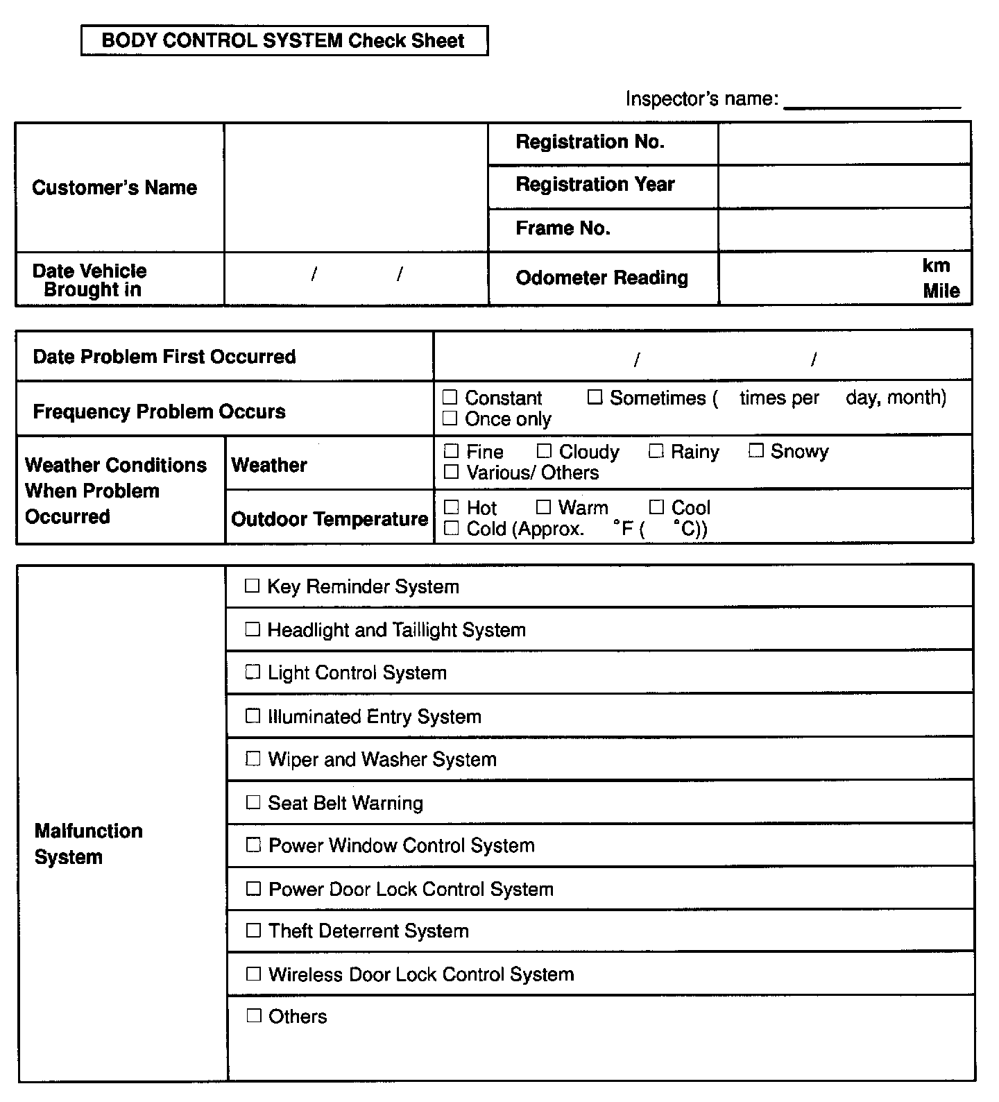 Body Control System Check List: