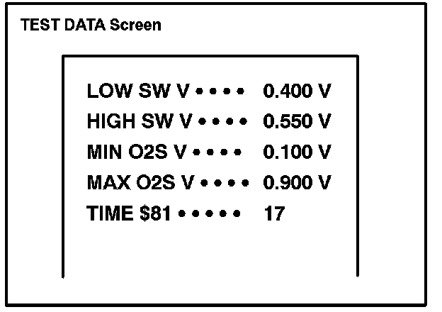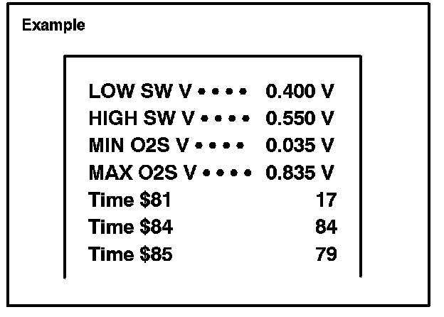 Before the O2S Monitor completes or after the ignition switch is turned OFF, the Diagnostic Tester displays the viewable upper limit or a lower limit of the test value (example: 0 V, 1.275 V, os [seconds], 10.2s, 0 and 255).