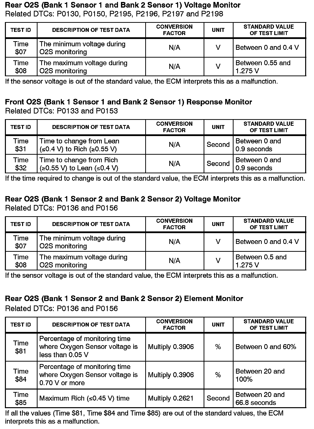 This Service Bulletin contains Oxygen Sensor (O2S) Monitor threshold values for all models from 1996 to 2003 and some 2004 models. Starting in 2004, the O2S Monitor threshold values can be found in the repair manual. These values are used when analyzing the 02S test results to determine the O2S condition.