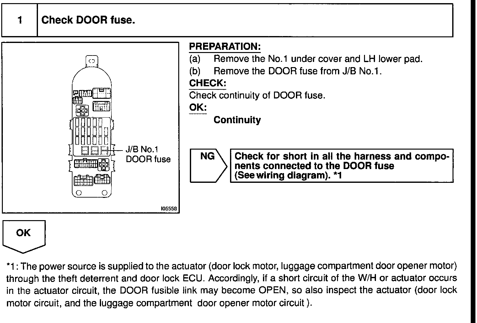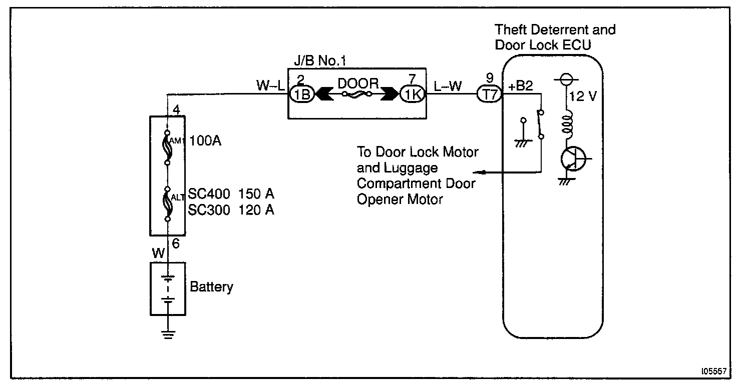 This circuit provides power to drive the door lock motor and the luggage compartment door opener motor.