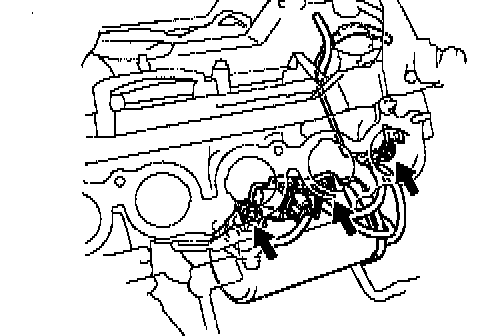 b) Disconnect the 2 water bypass hoses from the hose clamps on the cylinder head and oil filter bracket.