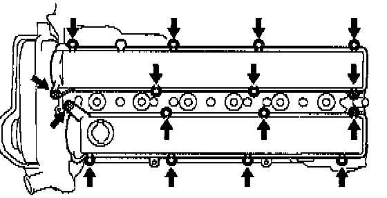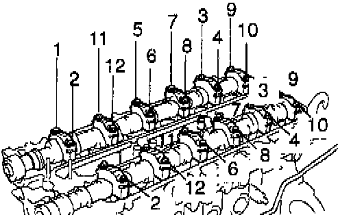 d) Uniformly loosen and remove the 12 camshaft bearing cap bolts, in several passes, in the sequence shown.