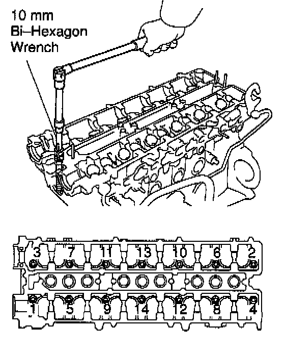 a) Using a 10 mm bi-hexagon wrench, uniformly loosen and remove the 14 cylinder head bolts, in several passes, in the sequence shown.