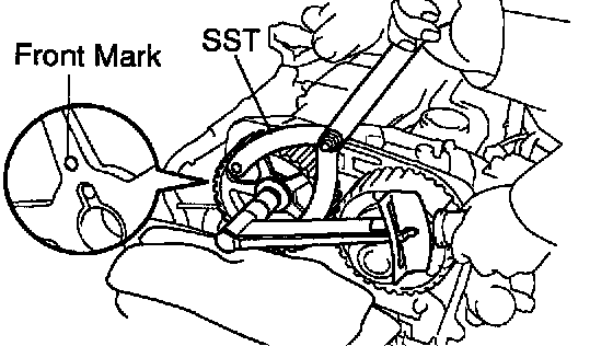d. Using SST, align the dot mark on the camshaft timing timing pulley with the timing mark of the No.4 timing belt cover.