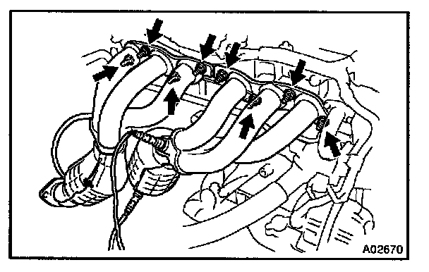 a. Using a 14 mm deep socket wrench, remove the 8 nuts, exhaust manifold and 2 gaskets.