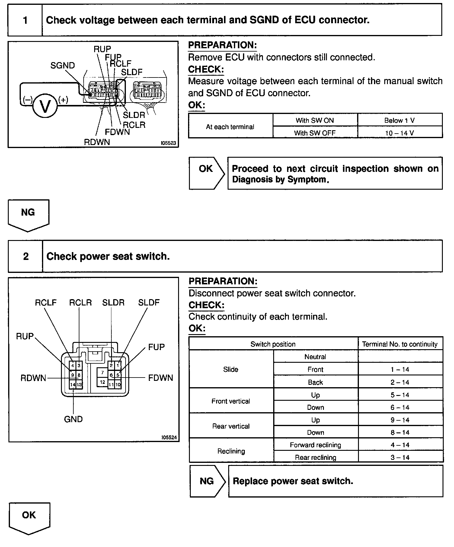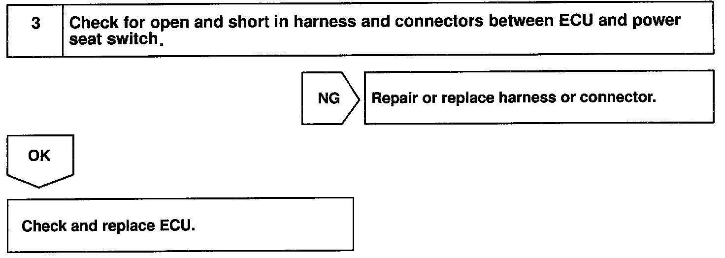 When the power seat switch is operated, a signal is sent from the power seat switch to the ECU and the ECU sends a signal to the motor to make it operate (except for the lumbar support).