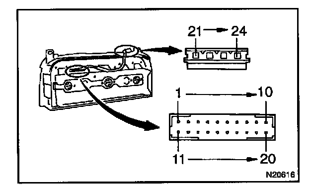 Connect the positive (+) lead from the battery terminal 21 and negative (-) terminal lead to 24 and then check that the illumination lights up.