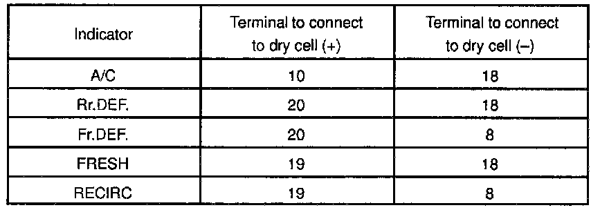 Connect the positive (+) lead from the battery to terminal 42 and negative (-) lead to terminal 43, then check that the indicator lights up, while switch is pressed.
