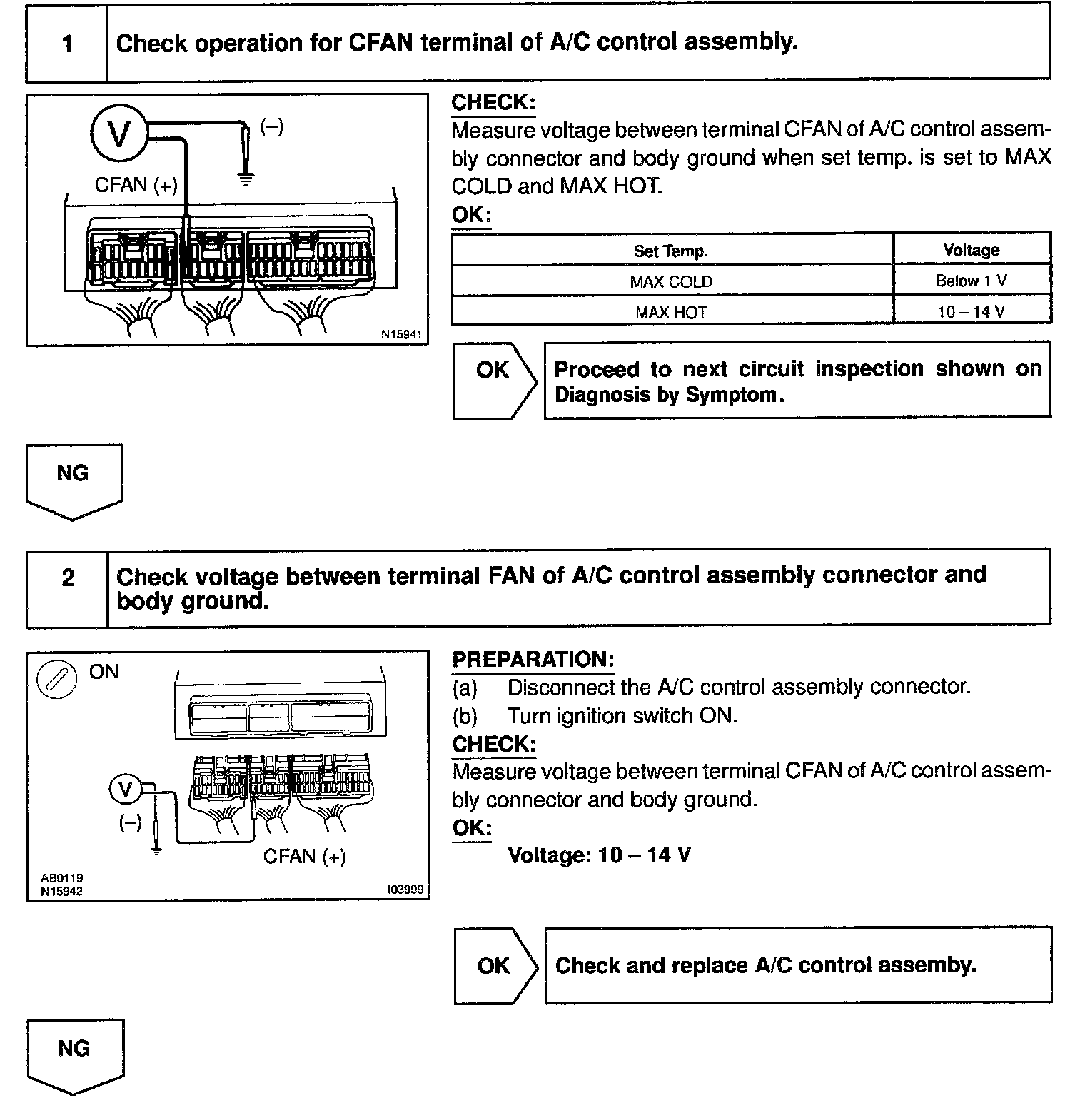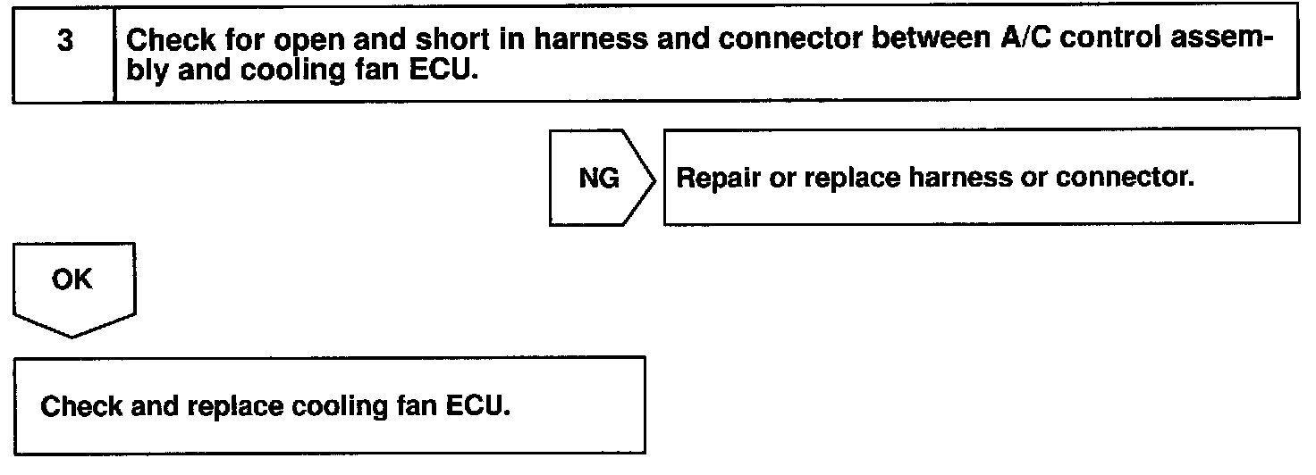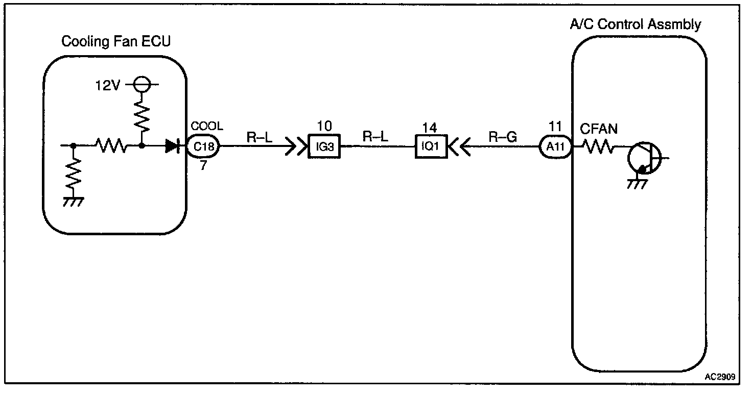 CIRCUIT DESCRIPTIONWhen the magnetic clutch relay is ON and the required outlet air temperature is a predetermined value, the A/C control assembly turns ON Tr1 inside the ECU. (Terminal voltage at the CFAN terminal is almost 0 V).