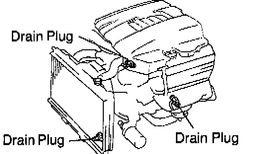 b) Remove the 3 drain plugs on the engine and radiator, and drain the coolant.