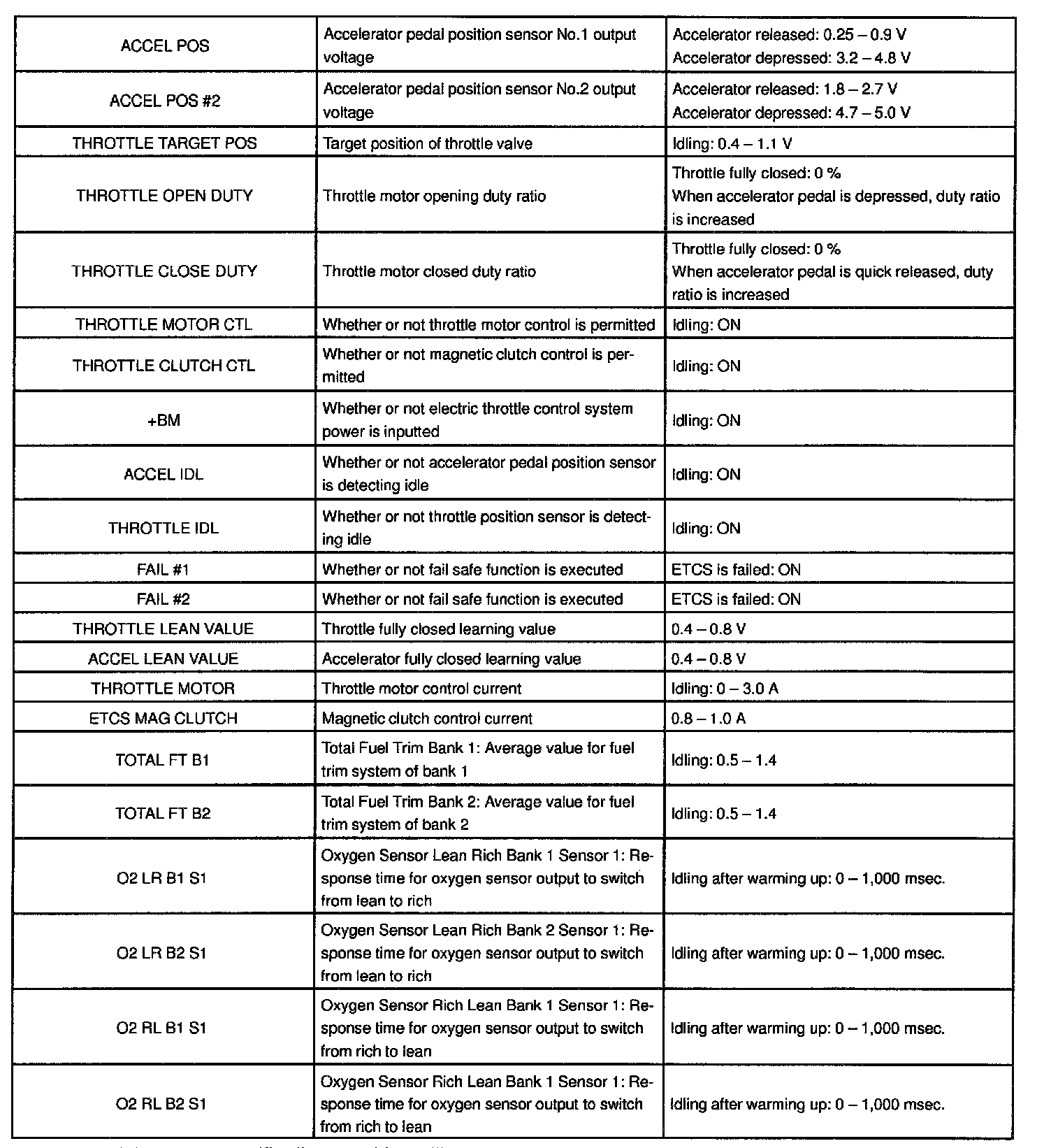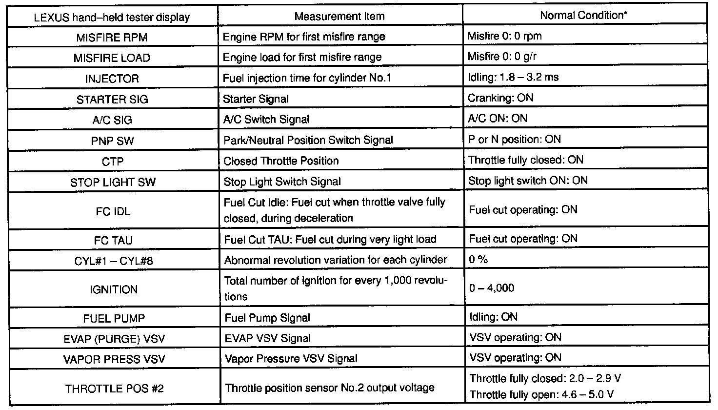 NOTE: The values given for "Normal Condition" are representative values, so a vehicle may still be normal even if its value varies differ from those listed here. So do not decide whether a part is faulty or not solely according to the "Normal Condition" here.