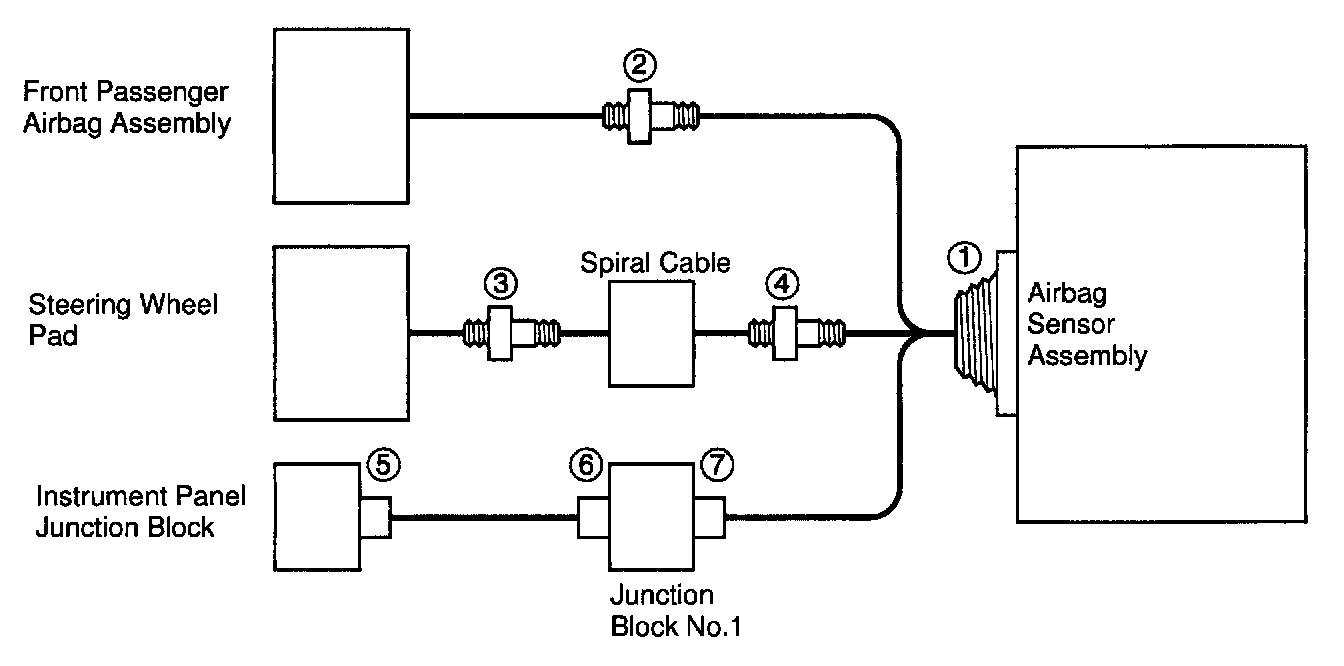 Each connector contains a short spring plate. When the connector is disconnected, the short spring plate automatically connects positive (+) terminal and negative (-) terminal of the squib.