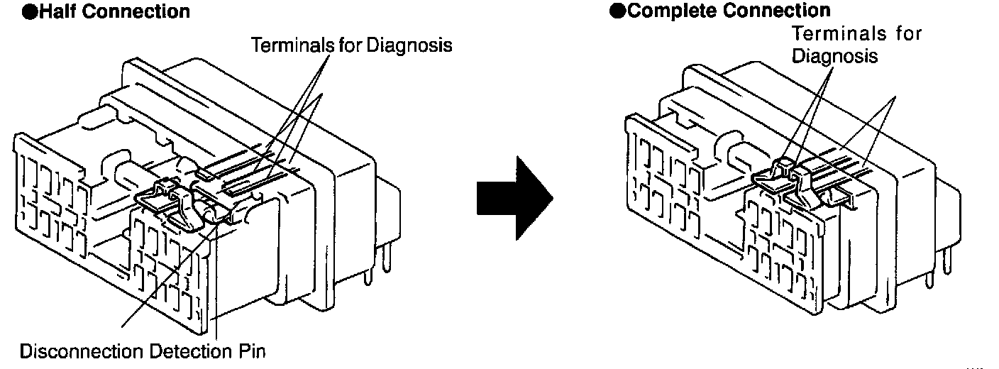This mechanism electrically checks that connectors are connected correctly and completely. The electrical connection check mechanism is designed so that the disconnection detection pin connects with the diagnosis terminals when the connector housing lock is locked.