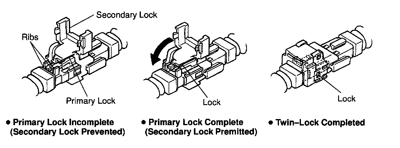 With this mechanism connectors (male and female connectors) are locked by 2 locking devices to increase the connection reliability. If the primary lock is incomplete, ribs interfere and prevent the secondary lock.