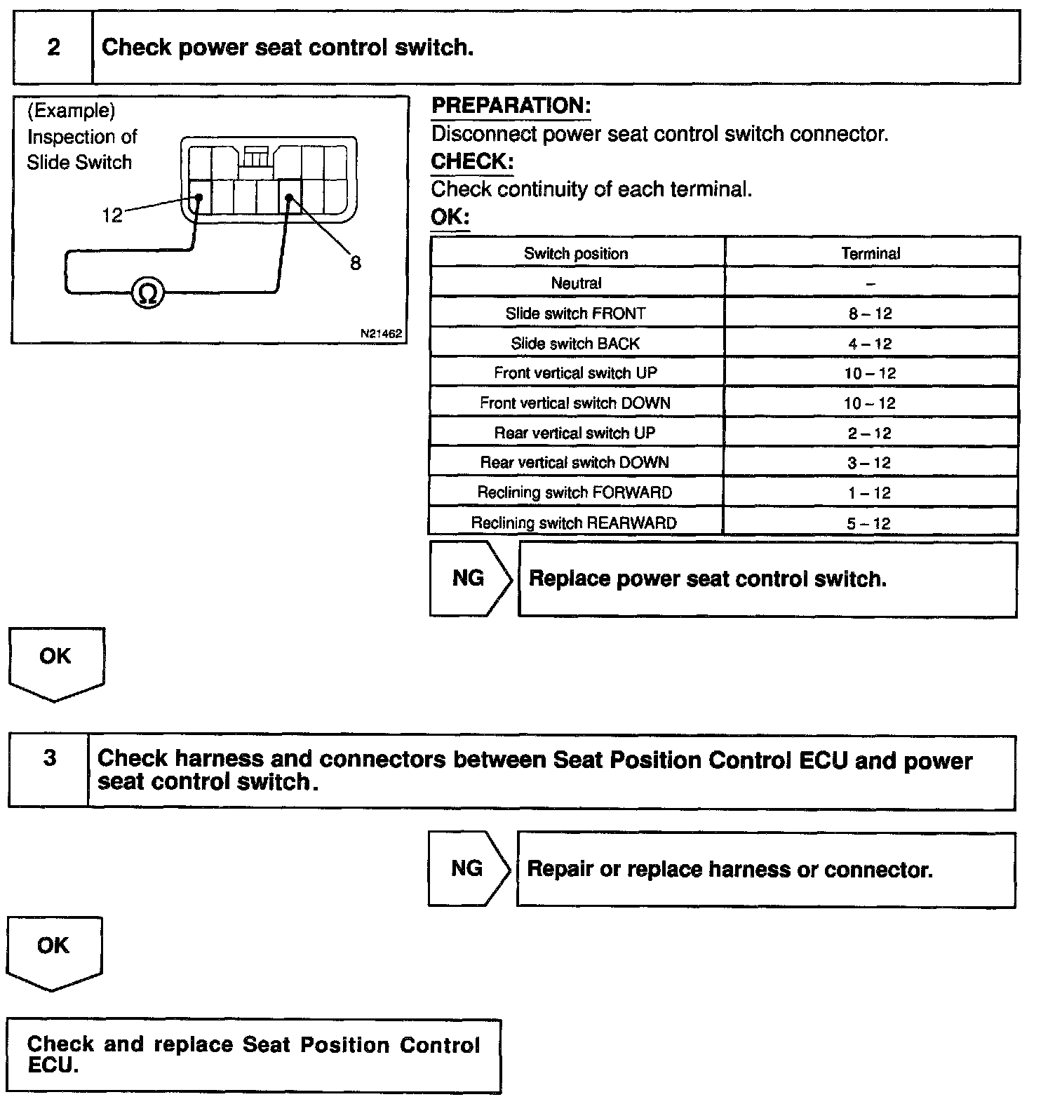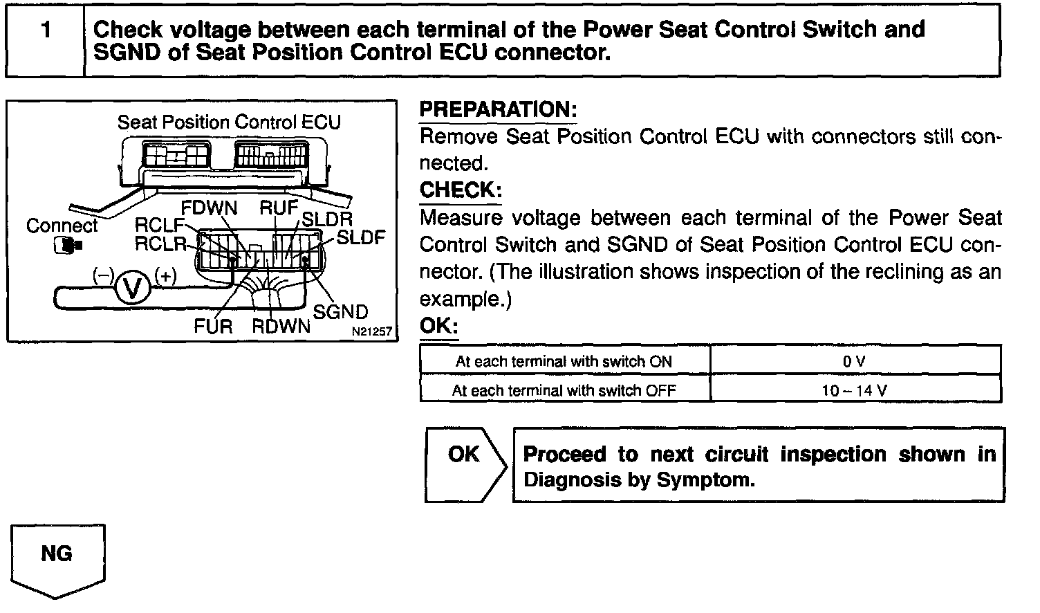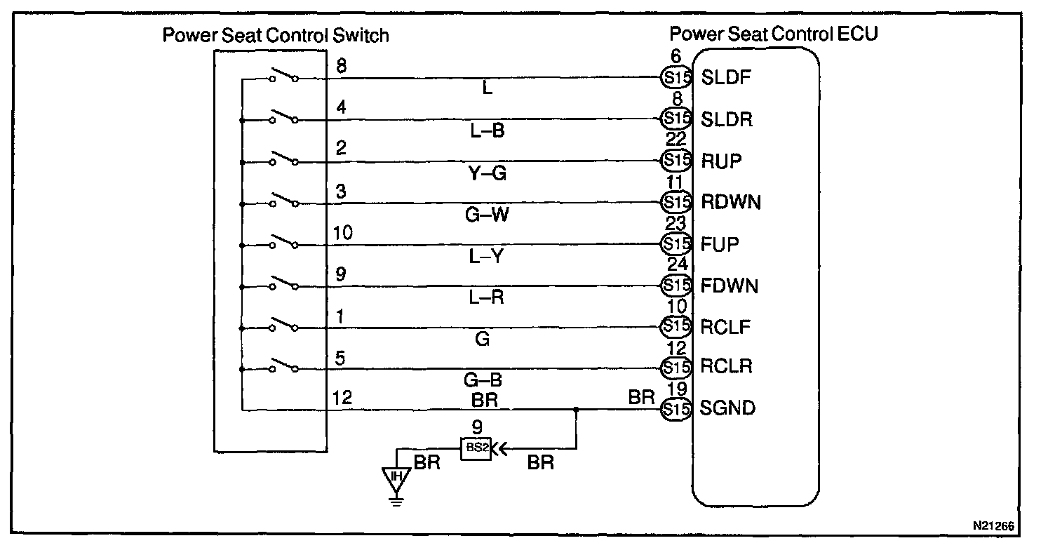 When the power seat control switch is operated, a signal is sent from the power seat control switch to the ECU and the ECU sends a signal to the motor to make it operate.