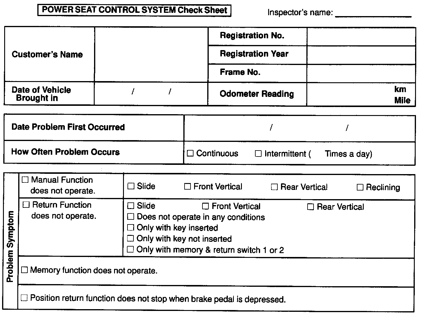 Power Seat Control System Check Sheet: