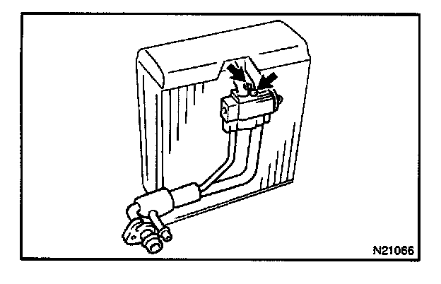 Using a hexagon wrench, remove the 2 bolts and separate the expansion valve and evaporator and tube.