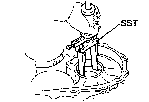 Using Special Service Tool (SST) and a press, remove the tapered roller bearing FR and RR.