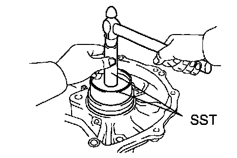 a. Using Special Service Tool (SST), a press and a hammer, press in a new bearing outer race into the transaxle housing.