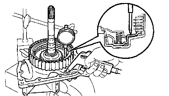 b. Using a dial indicator, measure the direct clutch piston stroke while applying and releasing compressed air(392 kPa, 4.0 kgf/cm2, 57 psi).