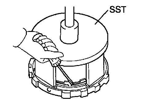 a. Place Special Service Tool (SST) on the piston return spring and compress.